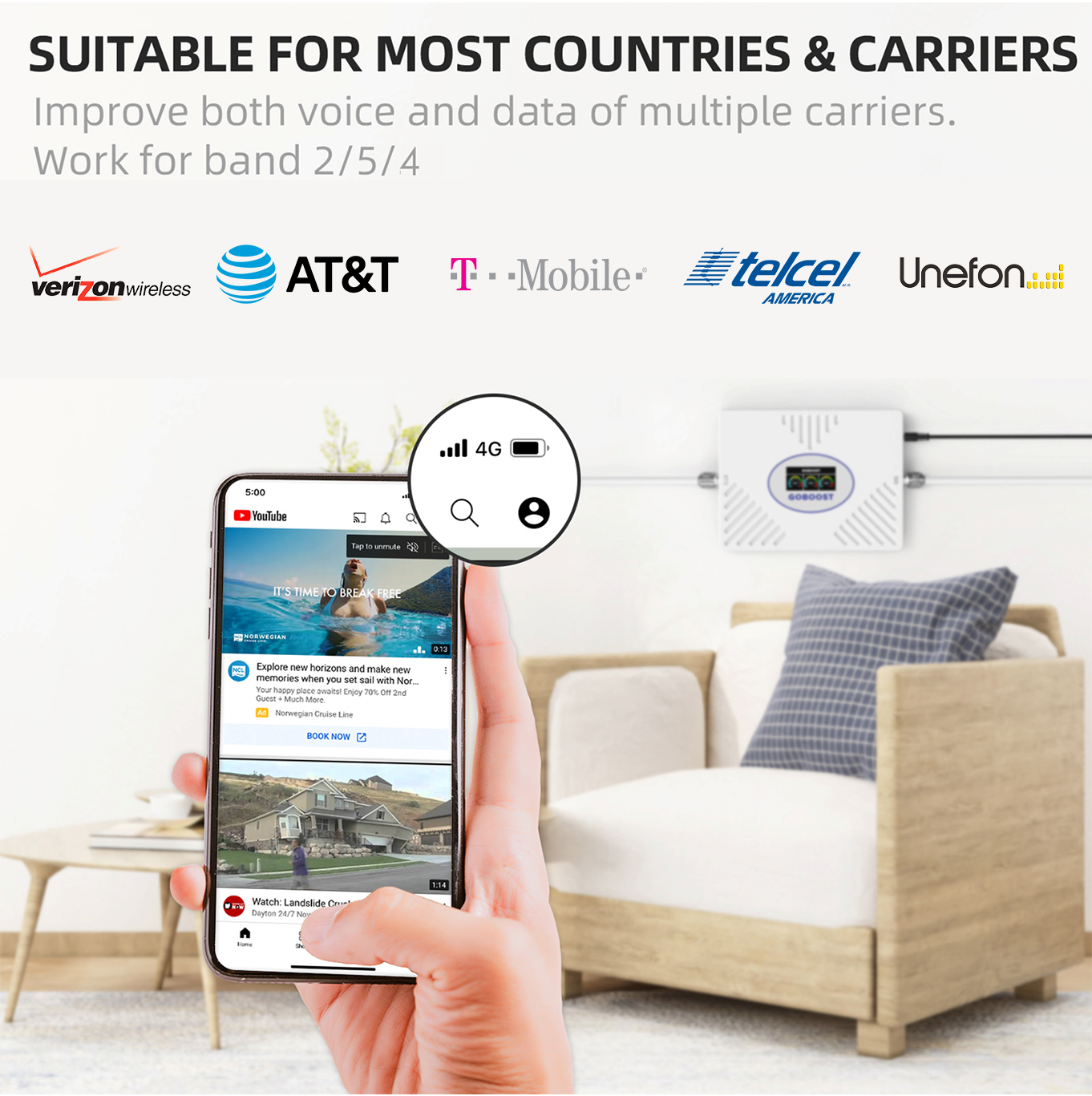 Como amplificador de señal de teléfono celular para apartamentos, GOBOOST es compatible con 2G, 3G, 4G y 5G LTE, y admite 1900 MHz. (Banda 2) , 1700/2100MHz (Banda 4) y 850MHz (Banda 5) . 850MHz (Banda 5) bandas celulares. Es compatible con todos los operadores de América del Norte, así como con operadores selectos de América del Sur, y es ideal para entornos residenciales de alta densidad, como apartamentos, ya que proporciona conectividad celular estable.